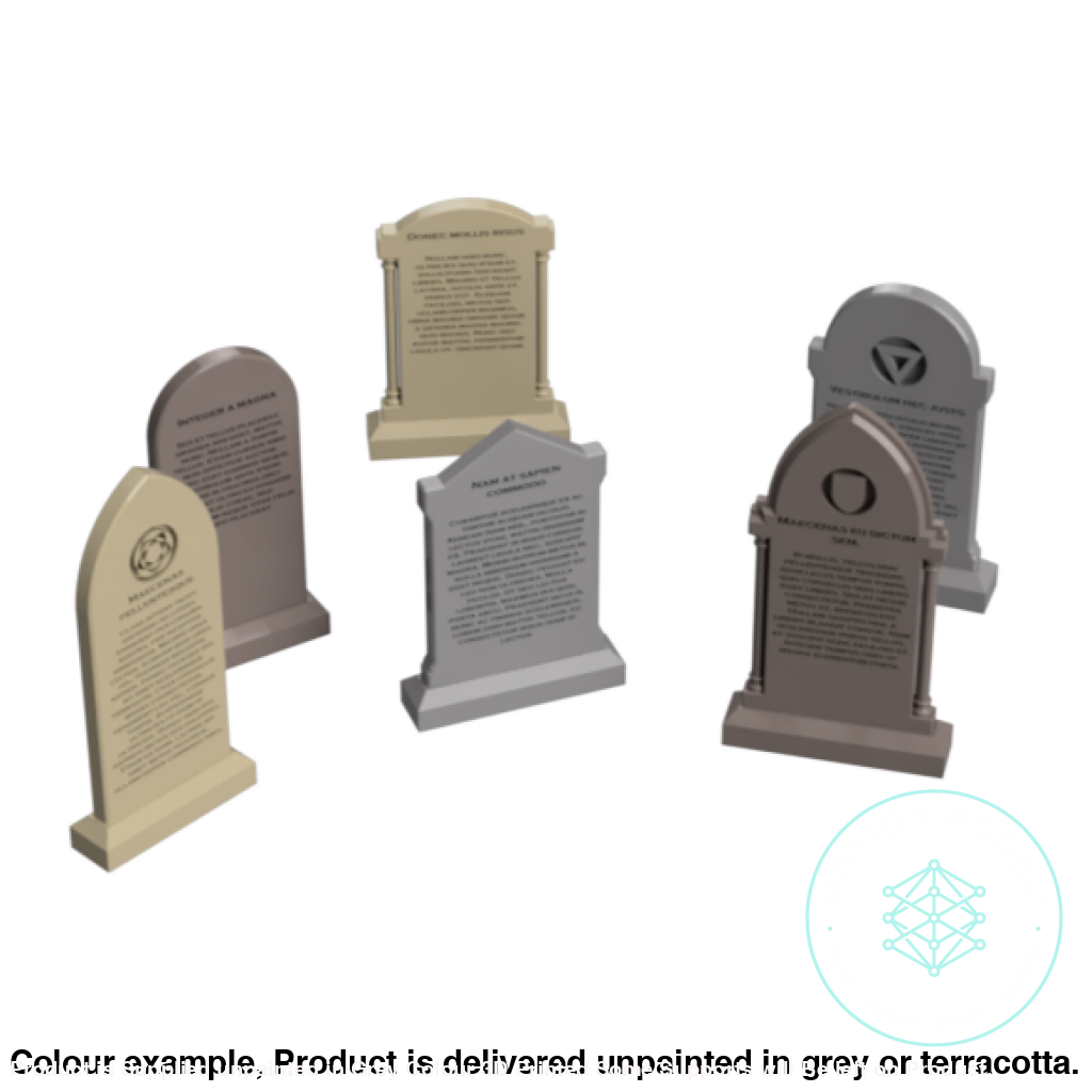 This pack contains 12 gravestones with 6 different shapes of headstone. These graves have a large headstone and some feature more ornate details. Each stone has a representation of an engraving.