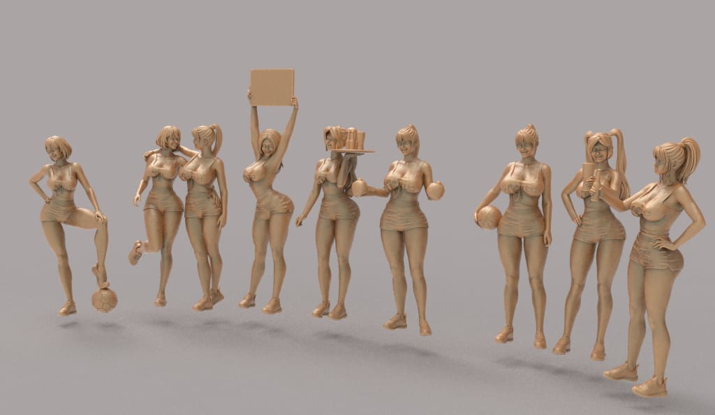 Set of eight female figure sculptures in various poses on a gray background